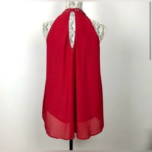 Pretty cherry red. Double layer, high low hem with stretch fabric underneath and semi sheer crepe on top. Keyhole back with covered button closure. Chest seams. In excellent vintage condition with no rips, stains or pulls.