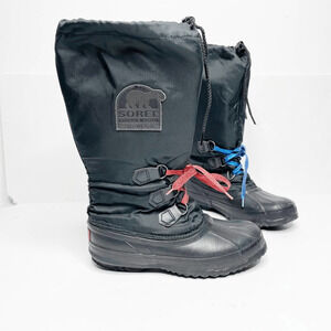 Vintage Sorel. Women’s US 7. Snowlion snow boot. Black. PU BACKED SYNTHETIC TEXTILE UPPER. WATER AND WIND RESISTANT. REMOVABLE 9MM RECYCLED FELT INNER BOOT WITH OMNI-HEAT™ REFLECTIVE LINING. 2.5MM BONDED FELT FROST PLUG. HANDCRAFTED WATERPROOF VULCANIZED RUBBER SHELL. COLD WEATHER COMFORT RATED TO -40°C.