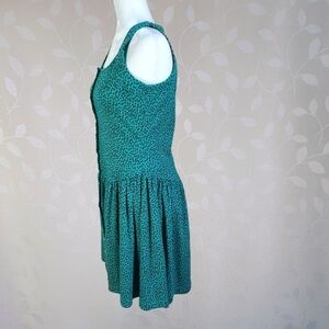Step into retro summer style with this vintage 90s South Beach mini dress in teal with a chic black polka dot print. Features a fitted sleeveless bodice, drop waist, gathered mini skirt, button front closure, and a playful cutout back detail. Soft cotton-poly blend for all-day comfort. A perfect piece for retro 80s or 90s party looks and fun at the beach.
