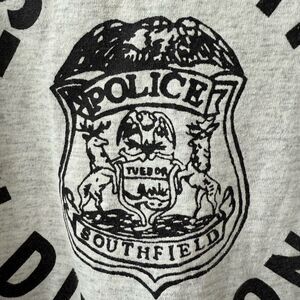 Vintage 90s single stitch screen stars best cotton and polyester blend gray Heather T-shirt that says Southfield police investigations division across the front. Laying flat measures 28 inches shoulder to hem and 24 inches armpit to armpit.