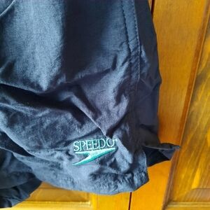 Vintage 90s Speedo navy blue mesh lined swim trunks. Pull on style with elastic waistband, drawstring closure, 2 hip pockets, mesh interior underwear liner, embroidered spellout logo on leg, large embroidered graphic logo on back, and side split seam legs. In excellent condition! 100% nylon shell, 100% polyester liner. Size medium.