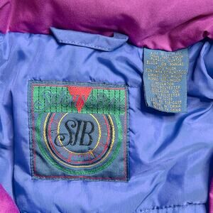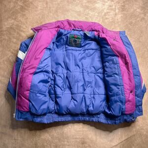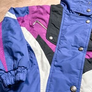 Puffy jacket with white, black, purple & fuchsia colors. Has a raised neckline, zipper & snap closure, and multiple pockets that zip. Vintage 1990s.