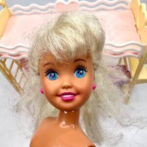 Vintage 90s Barbie Stacie doll with bunk bed. Bedroom set is missing the chair and the bottom drawer to the cabinet. Stacie's hair needs some TLC and she does not come with clothes. Selling as is.