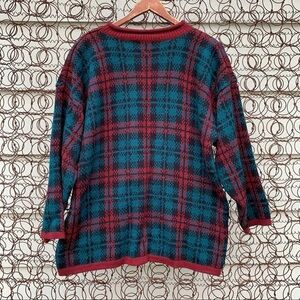 Vintage 90s Stefano International turquoise and red plaid knit sweater with shoulder pads. Oversized 90s style, size large