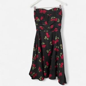 Vintage 90s Stop Staring! Rose Ruched Fit & Flare Strapless Midi Dress