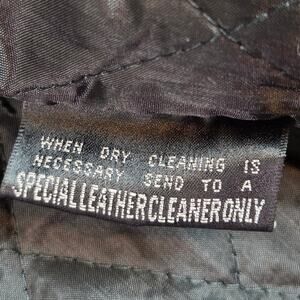 Classic Western-biker fusion design with front, back, and sleeve fringe, zip-front closure, and removable quilted liner. Supple leather shell with nylon lining and poly fill padding. Made in Korea and tagged Men’s 44 (Large). Genuine vintage piece with authentic wear character.