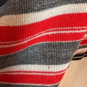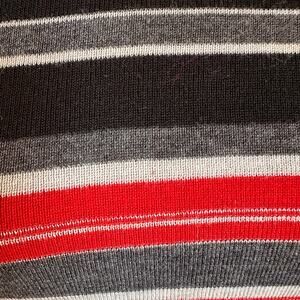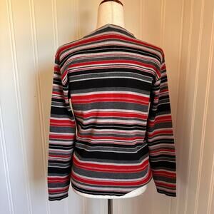 This vintage 90s long sleeved top is a size medium/large. It has a black, gray and red striped pattern. It's missing its tags but feels like acrylic. This top has twee vibes and is in good vintage condition.
