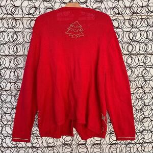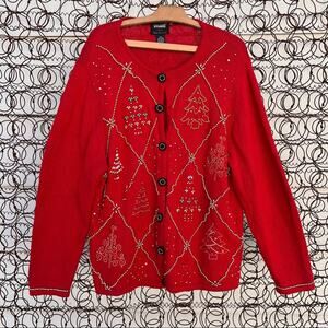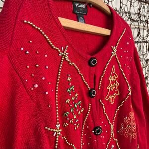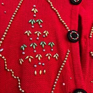 Vintage 90s Studio Joy red button down Ugly Christmas cardigan beaded trees