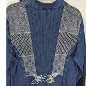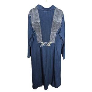 Vintage 90's Styleworks Chambray Denim Long Coat Lace Embroidered Patches