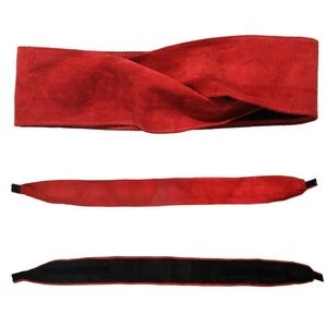 Vintage 90's red suede leather belt. The belt has strips of Velcro® on the lining of the belt where you attach the ends in a cross-over fashion. The photo shows the belt closed and the belt open (both inside and outside of the belt).
