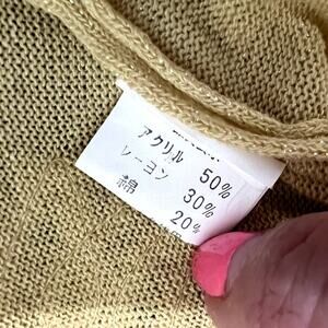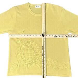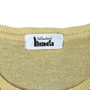 Details: Vintage 90s sunflower-embellished shimmer baby tee with short sleeves. Brand name partially unreadable (appears to be Ladies’ Konda/Bonda/Honda). Color is a soft yellow shimmer—see ruler photo for most accurate tone. Materials tag in Japanese, made of 50% acrylic, 30% rayon, and 20% cotton. Estimated size medium to large based on measurements.
