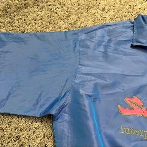 Vibrant vintage 90s iridescent blue windbreaker with neon Surf Style Interplanetary Body Gear graphic across the front. Features a half zip collar, elasticized stretch cuffs and hem, and a fabric square logo sewn on the chest. Made in USA.