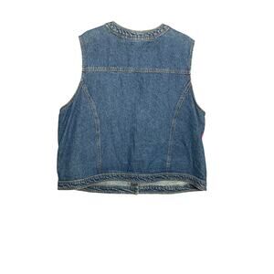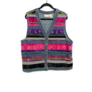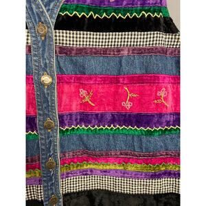Add a bold vintage flair to your look with this Susan Bristol Casuals denim vest in women’s size 2W. This unique statement piece features vibrant velvet and embroidered patchwork panels in shades of magenta, purple, green, and black, accented with ric-rac trim and black-and-white gingham details. Hand-embroidered and made in India, this vest blends Western denim style with bohemian and folk-inspired detailing.