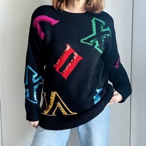 Vintage 90s Sweater Chaus Sport Size Black Sequin Roman Numerals Unique