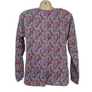 Vintage 90s Tahari woman's skirt and blouse set. Set is made of 100% silk from Hong Kong. Outfit is done in a pink, blue, tan and white geometric print. Blouse has a front button closure at the top and shoulder pads that could easily be removed. The skirt is pleated with a side button closure and hits below the knee. Set is a woman's size 2..