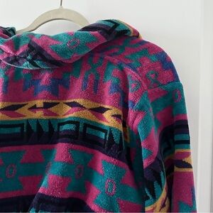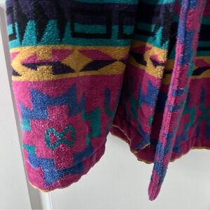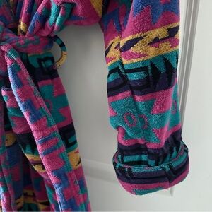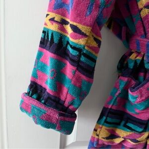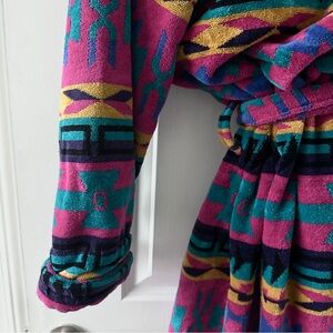 Bright and colorful vintage 80s/90s terry Turkish robe by TJ Lawford. Multicolor Southwestern/aztec pattern. Has front pockets and matching tie belt. 100% cotton.