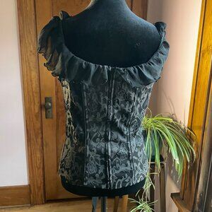 Vintage 1990s TRIPP NYC corset top, tagged size XL. Features a structured black floral brocade with ruffled off-shoulder neckline and lace-up ribbon front. Fitted waist, back zipper, and light stretch for that signature 90s goth-meets-Y2K silhouette.