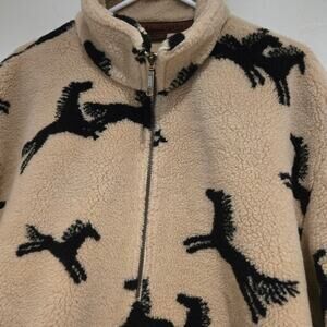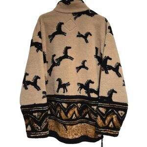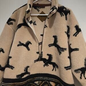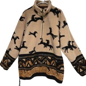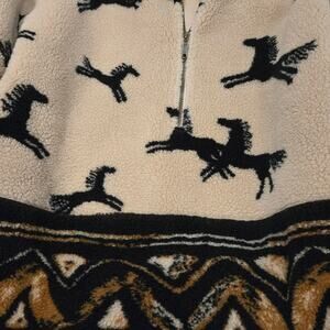 Cozy heavyweight sherpa fleece pullover featuring galloping black horses and Southwestern border trim. Zip front, mock neck, and relaxed fit. Toggle closure at bottom hem. Made in Canada, vintage from the late 90's, early 2000's, Y2K era.