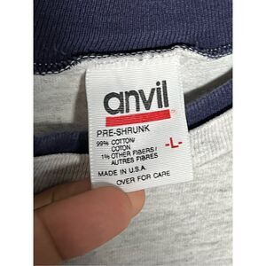 There’s some stains on the front as shown, as well as some tiny pinholes; one on the front, and a tiny one on the back. Single stitch bottom hem, double sleeved.