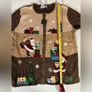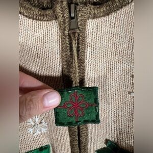 Gorgeous preowned 90s vintage condition; no noted defects; little to no wear The best of the Christmas sweater brands!! Tiara International, beautifully made. Love this one because its so different, you don't usually see brown/tan as background to all the Christmas embroidery. And the cute Christmas package zipper. Style: Sequin Embroidered Christmas Zip-up Embellished Holiday Approx measurements in pics Could be worn open or zipped.