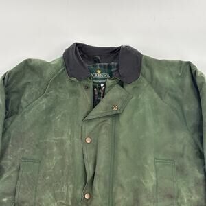 This Vintage 90s Tin Cloth Jacket Coat is a classic piece like a Barbour hunting jacket, made from rugged waxed cotton in a solid green color. The XXL size and regular fit make it suitable for men who appreciate a timeless outdoor style. With features like a zipper closure and hunting theme, this jacket combines practicality with a retro aesthetic, perfect for those who enjoy the 90s vibe and classic design.