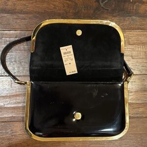 Chic Gucci shoulder bag in black with gold trim from 1994 the first Tom Ford collection. Sleek and stylish over the shoulder design, 11” x 7” and 1.5 inches deep. Some scratches on leather, the interior photo is hard to take because it’s a very narrow passage. I saved the original receipt from Bergdorf Goodman, it is from Tom Ford’s first collection that you can see on the runway and I bought it because it matched a belt that I bought. If you’re interested in seeing the belt, let me know.