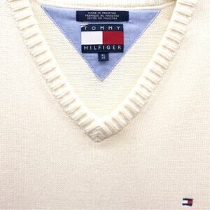 Vintage 90s Tommy Hilfiger Mens XL Flag Logo Cotton Knit Sweater Vest Ivory Tan
