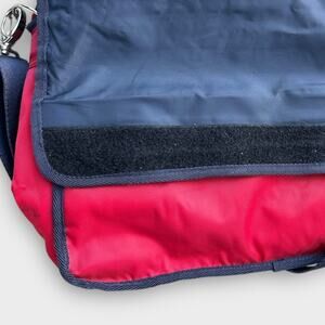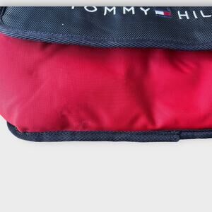 Vintage 1990s Tommy Hilfiger crossbody messenger bag in red and navy blue. Measurements below. This item is in good preowned condition. It has a few marks/stains on the bottoms and side. It also has a little bit of bubbling of the fabric on the top flap. (second to last picture)