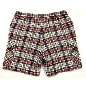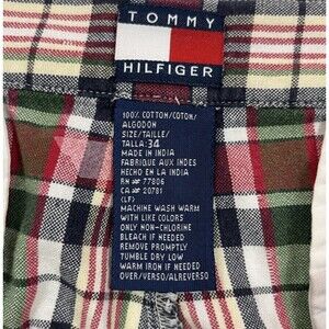 Take a step back in time with these vintage 90s Tommy Hilfiger plaid cargo shorts. Crafted with an 8" inseam, these shorts feature a striking red, white, and green plaid pattern, adding a touch of retro style to your summer wardrobe. These shorts are a size 34 waist, offering a comfortable fit for men. As a preowned vintage item, they are in very good condition, reflecting their quality and care over the years. Please refer to the provided pictures for a closer look at their design and condition.