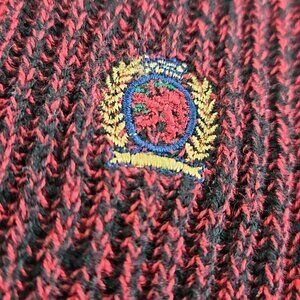 The Vintage 90's Tommy Hilfiger Sweater in red and black is a classic piece with a chunky knit design, featuring the iconic Tommy Hilfiger logo embroidered on the front. This pullover sweater is perfect for various casual and formal occasions, with a crew neck and long sleeves for a comfortable fit.