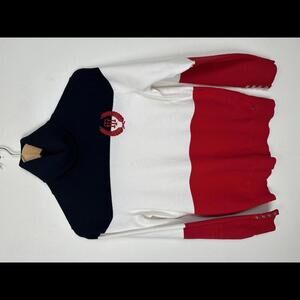 Oversized color block turtleneck sweater. Red, white, blue with red embroidered TH crest at chest. Long sleeve with small row of gold buttons. Lightweight sweater with cotton blend.
