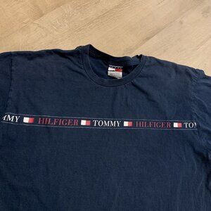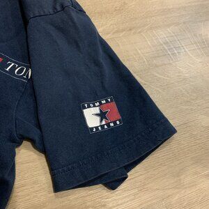 Vintage 90s Tommy Jeans T-Shirt Mens Large L Navy Blue Flag Spell Out Hilfiger Repeat Graphic Tee Retro Preppy Streetwear
