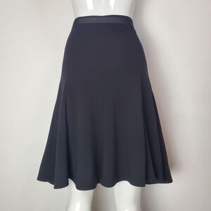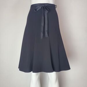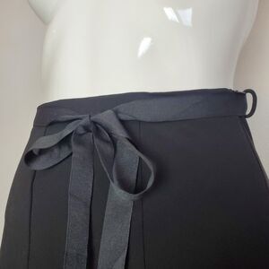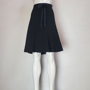 Vintage 90s Tracy Evans Limited black gored knee-length skirt with satin ribbon belt. High-waisted with side zipper closure and 2 belt loops.