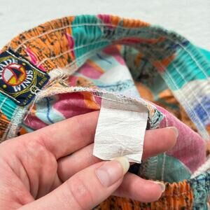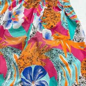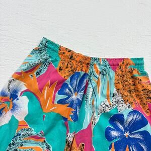 Vintage 90s Trade Winds tropical floral shorts featuring a bold hibiscus print in bright pink, teal, blue, orange, and white tones. Made in the USA with a soft woven cotton fabric, elastic waistband, and inner drawstring for an adjustable fit. Perfect for summer, beachwear, or laid-back vacation outfits.