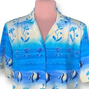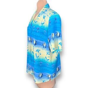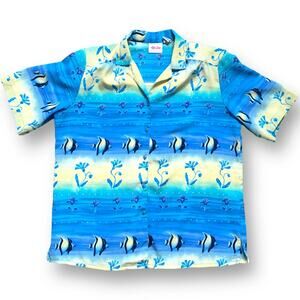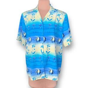 Vintage 90s Tropical Fish Print Shirt Blue Yellow Crinkle Button Front Top 14