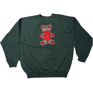 Get into the holiday spirit with this vintage 90s Tultex Christmas sweatshirt! Featuring a cute green bear with googly eyes and a solid knit fabric type, this sweater is perfect for any unisex adult who wants to show off their festive side. The crew neck and long sleeves make it a great choice for cold weather, while the regular fit ensures comfort and ease of movement. Made in the USA, this sweatshirt is a perfect addition to any holiday wardrobe. Its handmade design and unique teddy bear graphic it a must-have for any vintage christmas clothing lover. Don't miss out on this opportunity to add a touch of nostalgia to your wardrobe!