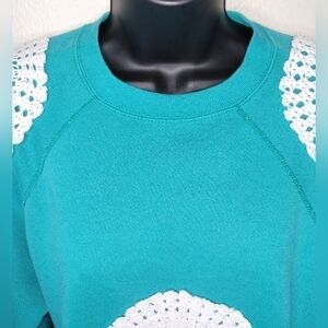 Vintage 90s Tultex Women's Medium Sweatshirt Grandmacore Crew Neck Made In USA Bows Doylies. No Pet/Smoke Odors Several White Bleach Splatter Spots(see photos please), Otherwise Good Shape. Classic Fit 22" Pit To Pit 25" Long. Condition Is "Pre-Owned".