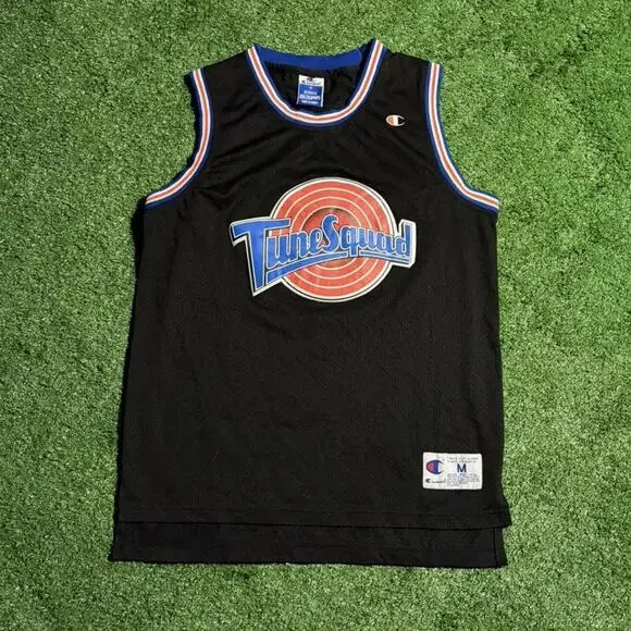 Vintage Tune Squad basketball jersey featuring the iconic Space Jam graphic on a classic Champion Authentic Athletic Apparel tag. Black mesh jersey with bold front Tune Squad logo and D. Duck 2 printed on the back, capturing peak 90s cartoon sports culture and NBA crossover nostalgia. Champion quality construction with breathable mesh and striped rib trim at the collar and armholes for an authentic on-court look. This vintage jersey is a standout piece for collectors and fans of Space Jam, Looney Tunes, and retro basketball aesthetics. Easy to style oversized or true to size as a statement layer or summer fit staple.