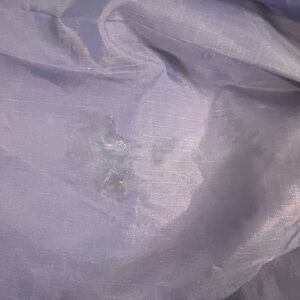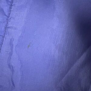 Does have 2 spots. One on the sleeve and one by the pocket. No size tag. Vibrant blue jacket with Looney Tunes logo. Features Bugs Bunny graphic. Ideal for fans.