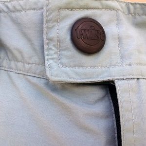In excellent condition! Twist Snowboarding Outerwear Gentech snow pants in subtle gray-blue with black lining and accents. Features cinched closures around the ankle, two front zippered pockets, and one zippered back pocket. 100% nylon with polyurethane outer shell and polyester/nylon lining and insulation. The lining, button, and pockets feature the stylish Twist type and target logo.
