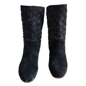 Beautiful Vintage 90's Lynnea Arroyo boots from UGG Australia. black woven leather 8" shaft can also be folded down, shearling lined foot, studs around foot and wood heel with rubber bottom.