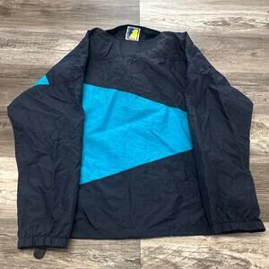 Vintage 90s Umbro International Sand Soccer Federation Blue Colorblock Mens Large Windbreaker Jacket In excellent pre-owned condition, lightweight, nylon polyester blend, navy blue purple, long sleeve, quarter zip, mock neck, retro funky embroidered chest logo, draw cord, colorblock, pullover, durable, breathable, athletic, sporty beachy, BSWW, made in USA.