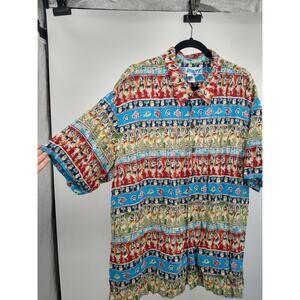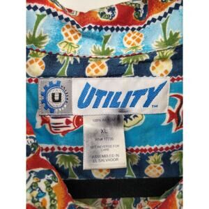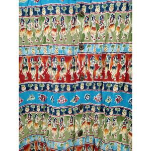 Vintage 90s Utility Mens Shirt XL Hawaiian Hula Girl Palm Tree Tropical Blue Red