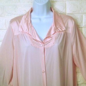 -- Vanity Fair made in Guatamala, Ladies -M(12/14), Semi-Sheer slinky embroidered floral applique, gathered yoke bodice collared, five Button closure, long sleeves cuffed, easy care wash Nylon in bright bubblegum Pink colorway.