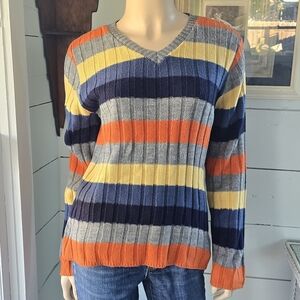 Vintage 90s Vanity Girl Gear Striped Tight Knit Wide Ribbed Sweater V-neck size small.