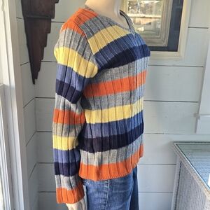 Gray, blue, light blue, yellow and orange stripes. Very soft and cozy pullover from my personal closet, originally purchased in the mid 90s.