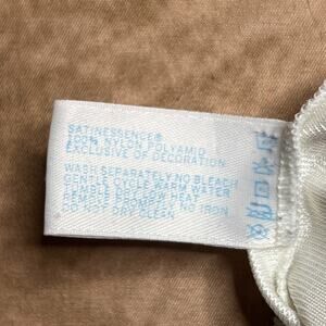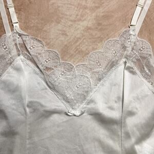 White satin and lace tank with a sheer art deco floral lace on the v neckline Has small lace hem and adjustable spaghetti straps. Vintage 1990s, made in USA.