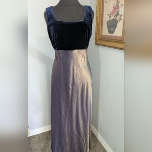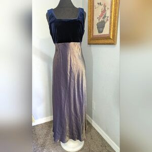 Stunning 90s does 1930s bias cut slip dress with a velvet bodice and satin iridescent skirt with beautiful sheen. piping iridescent trim at top, back zipper, flowy with back zipper