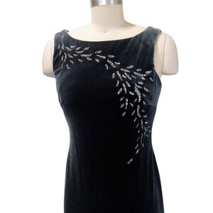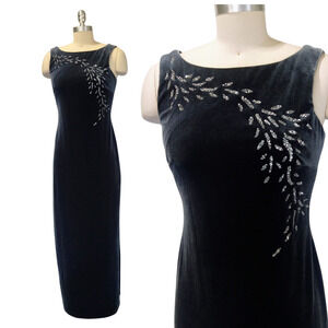 Vintage 90s to 2000s dark gray stretch velvet sheath maxi prom dress with fantastically sparkly glitter accents down the bodice. Marked size 4 petite, see measurements for best modern fit. In gently preowned condition, no flaws noted. Measurements are approximate, lying flat.