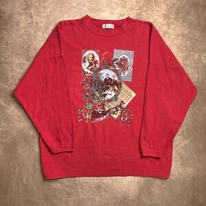 Long sleeve, pullover, antique style graphic print of angels, horses, flower sheet music, decorations & Christmas trees. Vintage 1990s.